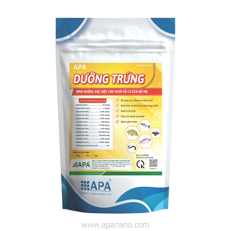 - Hòa APA DƯỠNG TRỨNG với lượng nước vừa đủ sau đó tưới đều vào thức ăn. Để thức ăn khô tự nhiên 20 – 30 phút trước khi cho cá, ếch ăn. Cho ăn trong suốt quá trình nuôi vỗ.