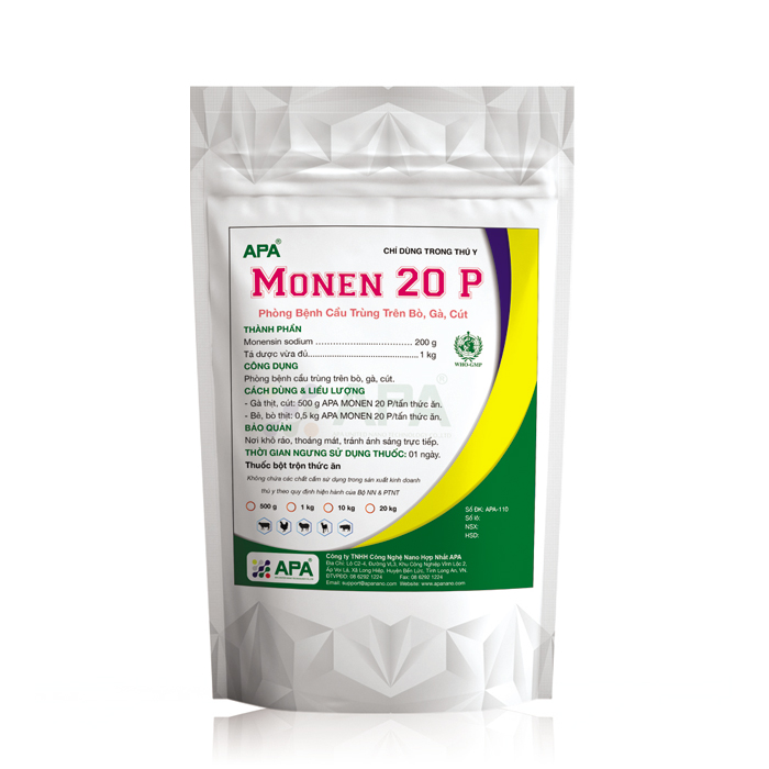 Broiler, quails: 500 g APA MONEN 20 P/ton of feed.